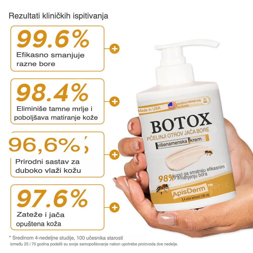 ApisDerm™ Botox BeeVenom krema koristi moćne peptide pčelinjeg otrova i tehnologiju sličnu botoksu za prodiranje aktivnih sastojaka u dublje slojeve kože. Pomaže u opuštanju mišića lica i smanjenju bora – bilo da su to bore na čelu, „smejalice“ ili fine linije oko usana. Hijaluronska kiselina dubinski hidrira kožu, popunjava fine bore i ostavlja kožu glatkom, svežom i mladolikom.